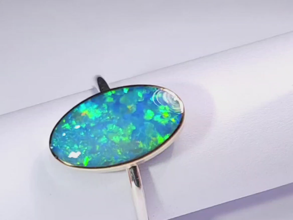 We've used hypoallergenic vitreous porcelain backing, crafted with decades-old, time-tested methods, and inlaid it in solid 14-karat yellow gold bezel with a 925 tarnish resistant 1.5 mm round silver band here at World Class Opal Australia.
