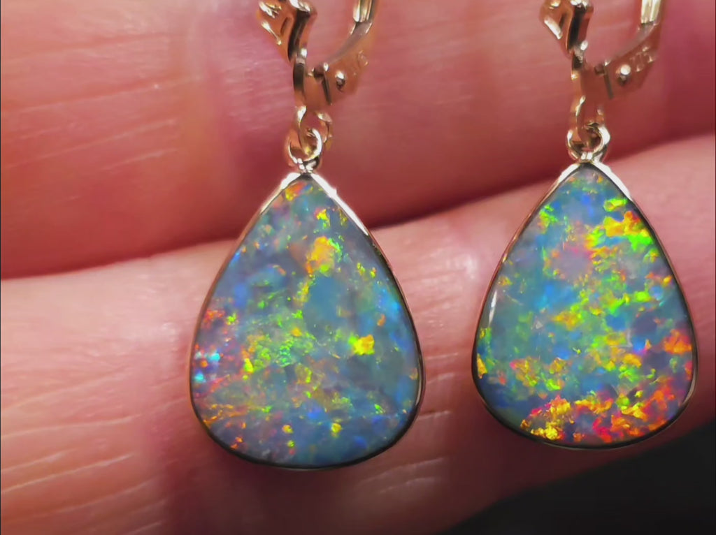 Here at World Class Opal, we've used hypoallergenic vitreous porcelain backing, crafted with decades-old, time-tested methods, and set them in solid 14-karat yellow gold bezels and jump rings with solid 9k gold continental clips to keep your valuable opal earrings super secure.