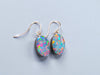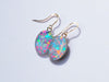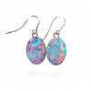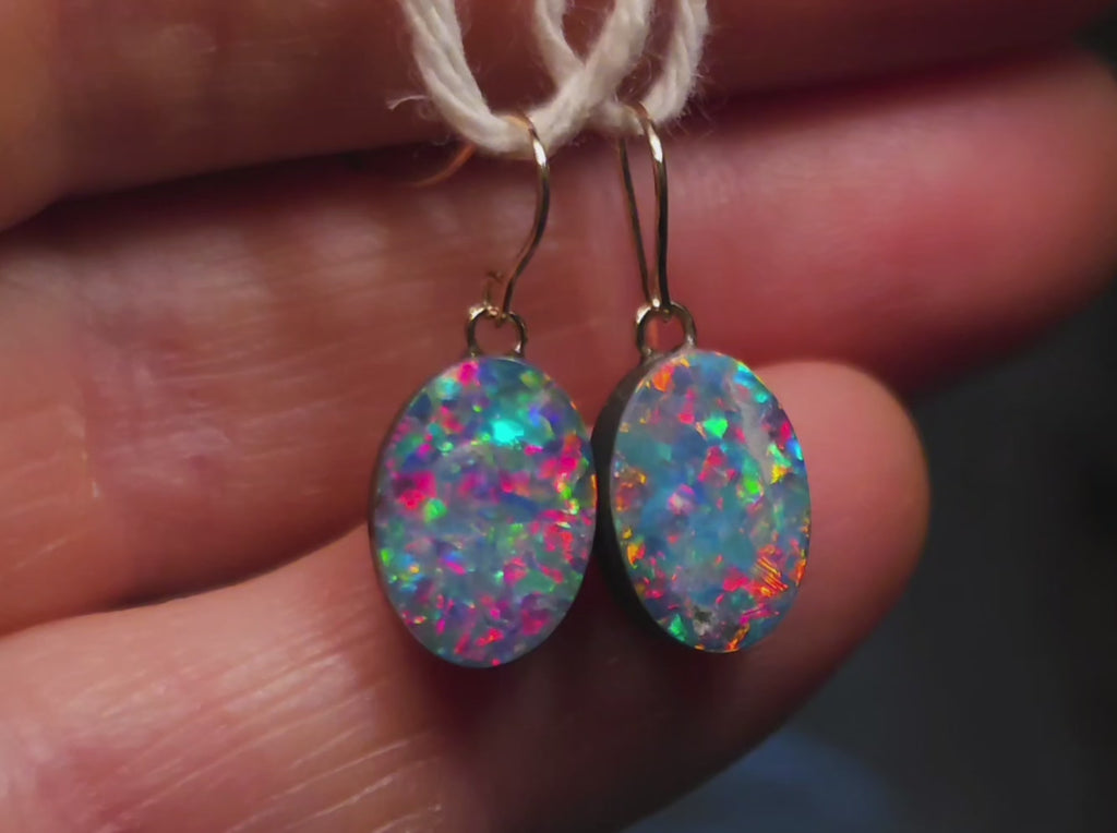 This genuine Australian opal mined by our company on the Dead Horse Gully opal field of Coober Pedy Australia, has been handcrafted into beautiful doublets using hypoallergenic vitreous porcelain backing, and set with a solid 14k gold pin and shepherd (French) hooks here at World Class Opal Australia.